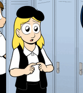 Next day (Monday, March 11) Sarah supported Susan in her fight against the school uniforms by wearing a beret to challenge the restrictions.[145] She watched as a group of students decided that they hated Susan, and feminism in general, more that they hated the uniforms.[146] When Principal Verrückt was about to discipline Sarah for wearing the beret, her puppy eyes made him allow it, to Susan's annoyance.[147]